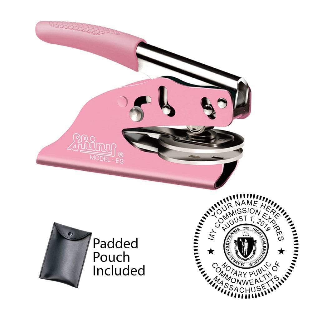 The Shiny EZ ES/EM/ED Massachusetts notary seal is the industry’s most advanced embosser. Engineered to provide increased pressure with minimal effort, the Shiny EZ embossing seal features an ergonomic handle, a modern design, and a dual hinge mechanism for increased leverage. The EZ ES/EM come in the following color options: Gray, Chrome, Blue, Red and Pink
